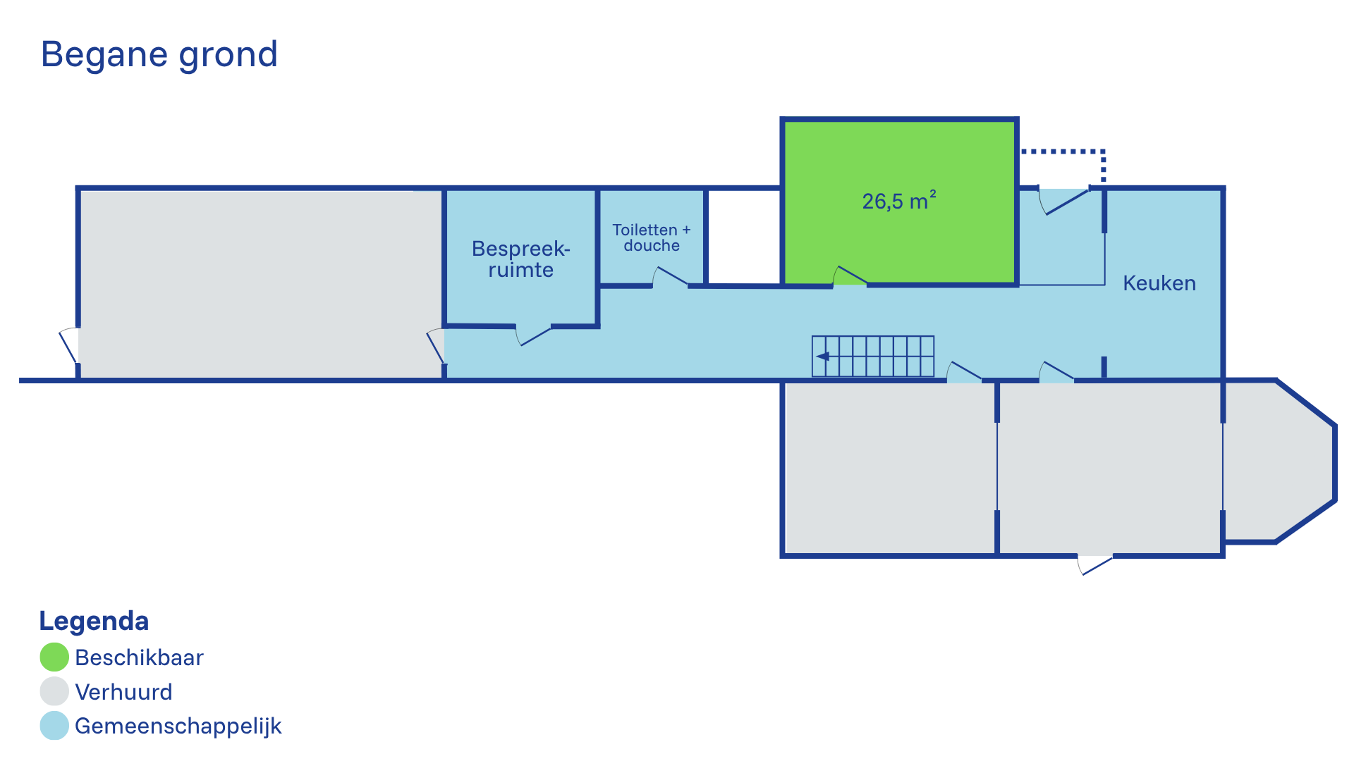 De werkplekken zijn ruim opgezet, met hoge plafonds en veel daglicht. Je kunt hier in alle rust en volledig gefocust werken. Authentieke details zoals de parketvloeren en de statige trap geven het pand een huiselijk karakter.